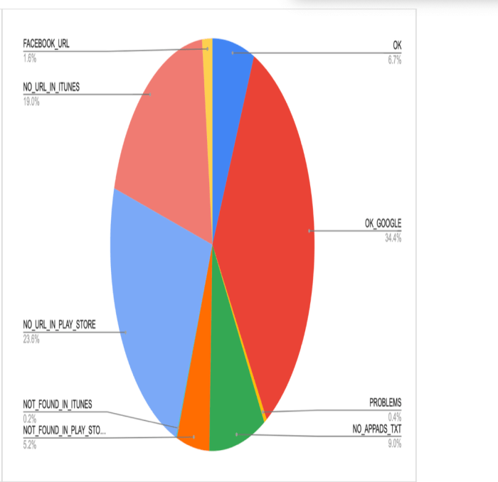 Result code Count OK 5,693 OK_GOOGLE 29,330 PROBLEMS 361 NO_APPADS_TXT 7,653 NOT_FOUND_IN_PLAY_STORE 4,417 NOT_FOUND_IN_ITUNES 134 NO_URL_IN_PLAY_STORE 20,112 NO_URL_IN_ITUNES 16,168 FACEBOOK_URL 1,378 BAD_DEV_URL 4